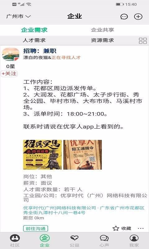 1、该软件的内存小,功能布局也简单,分为了社区、企业、公益和心声四个板块;