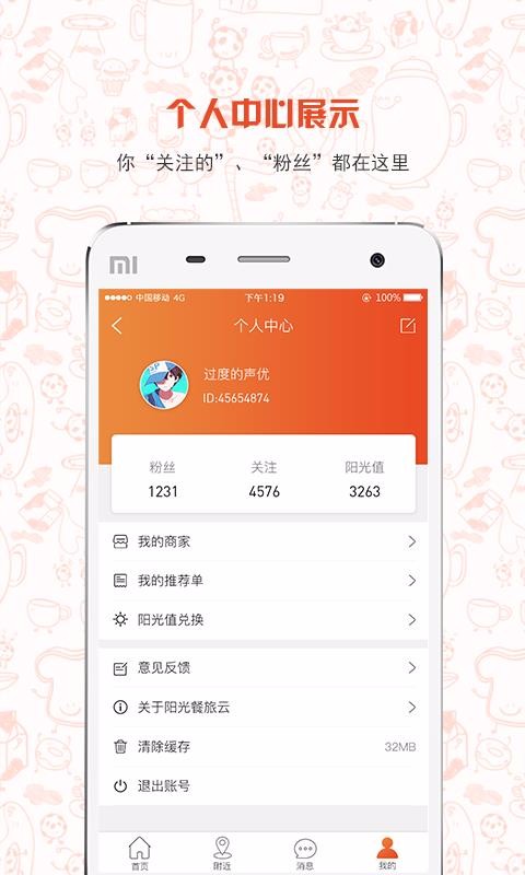 2、用户可以随时查看自己的粉丝数量、关注数量以及阳光值,实时更新;