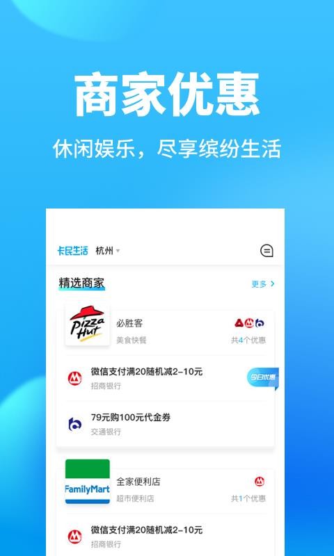 卡民生活app是一款为用户提供大量银行卡优惠的软件,为用户的生活节省更多的资金,改善用户的生活水平;应用中包含了多种方面的优惠信息,用户可以在这里快速找到自己需要的各种优惠,轻松享受更多的低价和折扣;用户通过软件可以让自己的吃住行都变得更加优质,使用更少的钱享受更好的生活,提升用户的生活体验;在这里,用户还可以通过刷卡来兑换各种各样的福利,让自己在使用银行卡的同时还可以免费获得一定的奖励;快下载这款软件试试吧,轻松找到各种各样的银行卡优惠信息,轻松使用银行卡搞定日常生活。