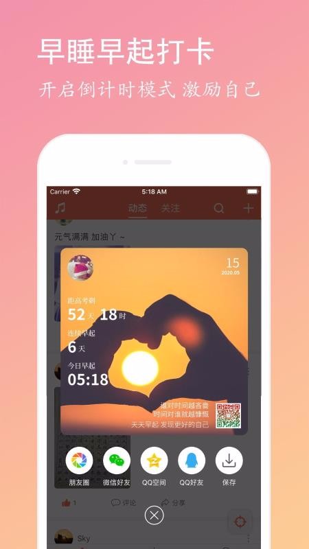 1、支持早起和早睡打卡,可以将打卡卡片进行分享或保存;