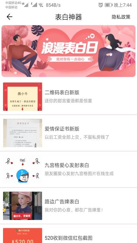 2、在首页中,用户可查看到众多的表白模板